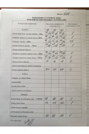 Комплект трехпредметный: жакет, брюки, джемпер. Жакет средней длины, полуприлегающего силуэта ,с отложным воротником (слева лейба), рельефы от проймы, на боковых деталях внутренние карманы и декор пуговицами, застежка на декоративный крючок, по спинке центральный шов и вертикальные рельефы, полочки переда на подкладке. Рукав 3/4, с отворотом из отделочной ткани, пата фиксируется пуговицами. Брюки прямые, с лампасами из отделочной ткани, оформлены притачным поясом, застежка молния + пуговица, на поясе по бокам вставлены резиночки. Джемпер из тонкого ажурного трикотажа, средней длины, впереди нагрудные вытачки, рукав короткий. Длина жакета сзади по спинке от плечевого шва: 69 см, длина рукава жакета 49см. Длина джемпера сзади по спинке от плечевого шва 66см, длина рукава джемпера 27 см. Длина брюк 99 см.