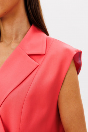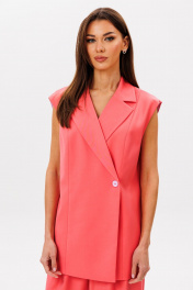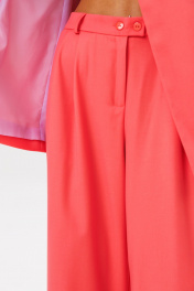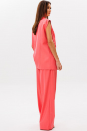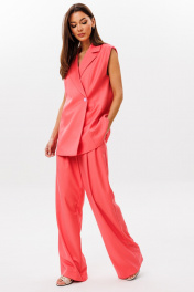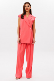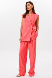 Стильный гармоничный комплект, состоящий из двубортного жилета и свободных брюк в стиле палаццо. Жилет двубортный прямого свободного силуэта в стиле oversize на подкладке. Линия плеча слегка спущена 16 см. Изделие состоит из вертикальных рельефных деталей на полочке и спинке. Горловина оформлена английским отложным воротником с лацканами, застежка двубортная фронтальная петли/пуговицы в области чуть выше линии талии. Длина изделия по среднему шву спинки 73-75 см (в зависимости от размерного ряда). Брюки комплекта созданы в свободном стиле палаццо. В пояс брюк по спинке вставлена эластичная тесьма, шириной 3 см. Спереди пояс фиксируется горизонтально на петли/пуговицы и вертикалную закрытую клапан-молнию (гульфик). При желании в пояс можно вставить ремень, так как имеются шлевочные держатели. В боковых швах: карманы с наклонным входом, на поясной линии талии расположены две неглубокие складки для свободы движения. Длина брюк по боковому шву 105-107 см (в зависимости от размерного ряда). (фурнитура может отличаться от представленной на рекламном фотоматериале) Особые рекомендации: рекомендуется холодная деликатная ручная стирка, без использования отбеливающих СМС, без интенсивного трения. Сушка в вертикальном положении. ВТО с минимальным паром.