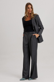 Стильный гармоничный комплект в стиле умеренного оверсайза, состоящий из свободного жакета и широких брюк. Эффектной деталью комплекта выступает высокая открытая шлица на спинке жакета, закрепленная пуговицами. Жакет прямого свободного силуэта на подкладке. На полочке изделия расположены вертикальные выточки и притачные боковые детали. Фронтально горизонтально расположены функциональные прорезные карманы с листочкой и клапаном. Горловина оформлена глубоким английским отложным воротником с лацканами. На спинке жакета расположена открытая высокая шлица (38 см) в среднем шве изделия, которая закреплена нефункциональными пуговицами. Длина изделия жакета по среднему шву жакета 69-71 см (в зависимости от размерного ряда). Рукав двухшовный, длиной 60-61 см. Брюки комплекта созданы в свободном стиле. В пояс брюк по спинке вставлена эластичная тесьма, шириной 3 см. Спереди пояс фиксируется горизонтально на петли/пуговицы и вертикалную закрытую клапан-молнию (гульфик). При желании в пояс можно вставить ремень, так как имеются шлевочные держатели. В боковых швах карманы с наклонным входом, на поясной линии талии переда расположена неглубокая складка для свободы движения, на задних полотнищах линии талии: вытачки. Длина брюк по боковому шву 108 см (без учета высоты пояса).