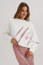 Блузон из уютного трикотажного полотна, свободного прямого силуэта. Линия плеча спущена, рукав прямой на зауженной манжете. Линия плеча состоит из притачного элемента: погона. Рукав основной состоит из двух деталей, в горизонтальном шве стачивания данных деталей расположен открытый разрез. По верхнему срезу расположены стразы. При желании длина рукава может трансформироваться и отверстием выступает открытый разрез. Длина рукава вместе с плечевой линией 75 см. Из них 13 см: длина плеча и 62 см: длина рукава. Высота манжета 5 см. На центральной части переда блузона расположены декоративные аппликационные элементы в виде ассиметричных полос из пайеток. Горловина округлая, оформлена притачной планкой, высотой 3 см. Низ блузона оканчивается притачной манжетой, высотой 6 см. Длина блузона по спинке изделия 70 см. Юбка из трикотажного полотна с пайетками, прямого свободного силуэта, на трикотажной подкладке. Линия талии оформлена притачным поясом на эластичной тесьме. Длина юбки по среднему шву спинки 78 см.