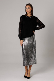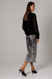 Блузон прямого силуэта на притачной манжете-поясе, чуть зауженной на линии середины бедра. Горловина округлая, обработана притачной планкой, шириной 1,5 см. Рукав втачной, одношовный, выполнен из ажурного трикотажного полотна. Низ рукава обработан манжетой из основной ткани. По линии горловины дополнительным декоративным элементом расположены термо-стразы. Длина блузона по спинке 56-58 см. В зависимости от размерного ряда. Длина рукава 59-60 см. Юбка из трикотажного полотна с пайетками, на укороченной подкладке прямого силуэта, чуть зауженная к низу. В среднем шве размещена потайная молния и открытый разрез. На линии талии размещены классические вытачки. Пояс внутренний, обтачной. Длина юбки по среднему шву 80-81 см. Высота разреза 32 см. (фурнитура может отличаться от представленной на рекламном фотоматериале) Особые рекомендации: рекомендуется холодная деликатная ручная стирка, без использования отбеливающих СМС, без интенсивного трения. Сушка в вертикальном положении. ВТО с минимальным паром.