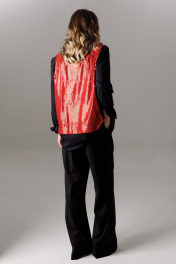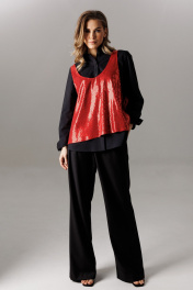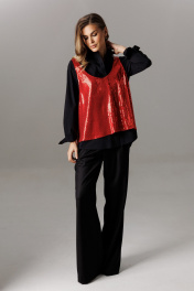 Блуза прямого свободного силуэта с рубашечным воротником на стойке и зауженным рукавом на манжете со спущенной линией плеча. Спереди на функциональной планке петли/пуговицы. Спинка изделия имеет горизонтальную плечевую кокетку (высота кокетки 20 см) и встречную складку для свободы движения. По плечевому шву заложена складка. Низ блузона слегка фигурный: спинка и полочка чуть длиннее бокового шва. Длина изделия блузона по спинке 73 см. Рукав рубашечный одношовный завершается манжетой (высота 5 см) с застежкой петля/пуговица. Длина спущенного плечевого шва 33 см. Длина рукава с манжетой 41 см. Брюки комплекта созданы в свободном стиле. Силуэт брюк к низу изделия имеет расклешение. В пояс брюк по спинке вставлена эластичная тесьма, шириной 3 см. Спереди пояс фиксируется горизонтально на петли/пуговицы и вертикальную закрытую клапан-молнию (гульфик). При желании в пояс можно вставить ремень, так как имеются шлевочные держатели. В боковых швах: карманы с наклонным входом, на поясной линии талии переда расположена неглубокая складка для свободы движения, на задних полотнищах линии талии-вытачки. Длина брюк по боковому шву 108 см (без учета высоты пояса). Майка выполнена из трикотажного полотна с пайетками свободного прямого силуэта в стиле оверсайз. Спереди и сзади имеет глубокие овальные вырезы и удлиненную линию проймы. Майка съемная. Длина изделия от плечевого шва по спинке 62 см. (фурнитура может отличаться от представленной на рекламном фотоматериале)