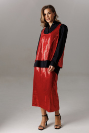 Блуза рубашечного покроя с втачным одношовным рукавом с манжетой. Спинка изделия состоит из горизонтальной кокетки и основной детали, на которой расположены две складки для свободы движения. Линия низа: фигурная. Рукав втачной, одношовный, с притачной манжетой, высотой 5,5 см и разрезом-планкой для петли/пуговицы. Высота планки- 11 см. Длина рукава в готовом виде 61 см. Горловина оформлена стойкой и рубашечным воротником. Застежка вертикальная на планках петли/пуговицы. Длина блузы по спинке 74-76 см (в зависимости от размерного ряда). Майка выполнена из трикотажного полотна с пайетками свободного прямого силуэта в стиле оверсайз. Спереди и сзади имеет глубокие овальные вырезы и удлиненную линию проймы. Майка съемная. Длина изделия по от плечевого шва по спинке 62 см. Юбка из трикотажного полотна с пайетками, прямого свободного силуэта на трикотажной подкладке. Линия талии оформлена притачным поясом на эластичной тесьме. Длина юбки по среднему шву спинки 79 см.