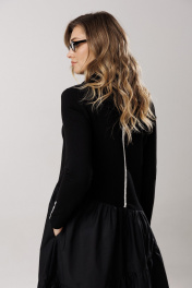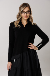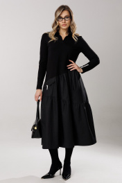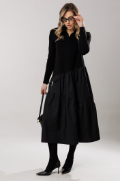 Восхитительное платье свободного А-силуэта с ассиметричным отрезным уклоном по линии талии и притачивания воланов юбки изделия, горловиной в стиле поло. Полочка и спинка платья отрезные по линии талии с ассиметричным уклоном. Верх изделия из трикотажного полотна. Спереди расположены горизонтальные нагрудные вытачки. Горловина платья оформлена V-образным вырезом с заходящими планками и отложным воротником со стойкой, в стиле поло. Глубина выреза 13-14 см. Ширина планок 3 см. Рукав прямой, одношовный, втачной. Линия плеча чуть спущена на 1,5 см. Длина рукава 59-60 см. Длина изделия по спинке 124,126 см (в зависимости от размерного ряда). Декоративным элементом выступает контрастная тесьма, расположенная вертикально по центру линии спинки лифа платья и фрагментарно на одном из рукавов изделия. Юбка платья А-силуэта состоит из двух составных воланов под уклоном на умеренной сборке. На линии соединения талии с юбкой платья с одной стороны переда втачена нефункциональная деталь-клапан. В боковом шве юбки изделия расположен внутренний карман. Длина платья по спинке 124-126 см (в зависимости от размерного ряда). (фурнитура может отличаться от представленной на рекламном фотоматериале) Особые рекомендации: рекомендуется холодная деликатная ручная стирка, без использования отбеливающих СМС, без интенсивного трения. Сушка в вертикальном положении. ВТО с минимальным паром.
