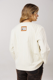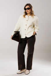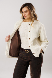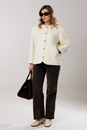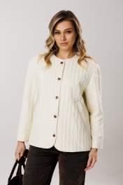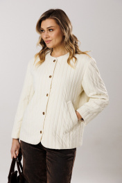 Жакет на подкладке из актуального стеганого полотна, прямого свободного силуэта с прибавками умеренного направления oversize. Линия плеча чуть спущена. Рукав втачной, двухшовный. Длина рукава 60-62 см. На полочке расположены прорезные косые карманы с листочкой. Горловина округлая, а также низ бортов с закругленным краем. Застежка фронтальная вертикальная на петли/пуговицы. На спинке жакета настрочена в качестве декоративного элемента нашивка, в тон изделия. Длина жакета по спинке 66-69 см в зависимости от размерного ряда.