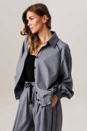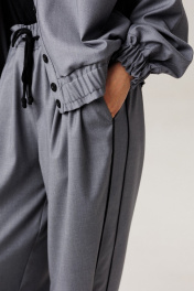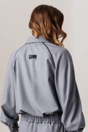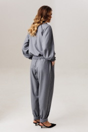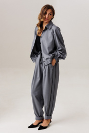 Современный комплект-двойка, состоящий из свободного блузона в стиле бомбер без подкладки, с рукавом реглан и брюками-бананами, зауженными к низу. Блузон, прямого свободного силуэта на притачном поясе с эластичной тесьмой внутри. Рукав-двухшовный реглан, к низу которого притачен манжет с эластичной тесьмой внутри, которая создает эффект сборки в стиле буф. Длина рукава с плечевой линией и манжетом 75-78 см (в зависимости от размерного ряда). По линии притачивания рукава (спинка и полочка) вставлен кант контрастного тона, который зафиксирован отделочной строчкой, также на спинке, в качестве декоративного элемента расположена нашивка, в тон канта. Спереди блузона притачены вертикальные планки для функциональной застежки на петли/пуговицы, шириной по 3 см. Горловина изделия округлая, с отложным рубашечным воротником на стойке. Длина изделия по спинке 62-64 см. Брюки современного свободного силуэта с заужением к низу в стиле «бананы». Карманы-хулиганы расположены в боковых швах. Спереди на линии талии расположены неглубокие модельные складки. В боковых швах вставлены по всей длине вертикальные планки-лампасы, шириной 4 см с отделочным контрастным кантом 0,3 см, который зафиксирован отделочной строчкой. Пояс притачной, с эластичной тесьмой внутри и дополнительным шнуром для изменения объема талии. Высота пояса 5,5 см. Оканчиваются брюки легкой сборкой и притачным манжетом-отворотом. Длина брюк по боковому шву с отворотом 100 см. Представленная фурнитура может отличаться от представленной на фото/видео материале