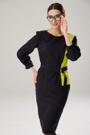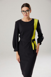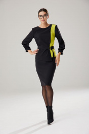 Элегантный комплект, состоящий из блузона с ассиметричной вставкой из контрастного тона в блузоне и облегающей юбки на подкладке. Блузон полуоблегающего силуэта, спереди расположены горизонтальные вытачки. Передняя часть состоит из двух деталей: контрасного бочка меньшей ширины и большей центральной части. Центральная часть по низу изделия ниже основной длины на 6 см. По спинке расположен средний шов, в котором находится застежка-молния. Длина по среднему шву спинки 57 см. Горловина округлой формы. Рукав втачной, обьемный у запястья, длиной 53 см. По низу рукава расположены отстроченные встречные складки, высотой 4 см, имитирующие манжет. Юбка комплекта облегающего силуэта, на подкладке, зауженная к низу. По талии расположены талиевые вытачки. верхний край юбки обработан обтачным поясом. В среднем шве расположена застежка-молния и открытый разрез, высотой 20 см. Длина изделия по боковому шву 64,5 см. Комплект дополнен текстильным сьемным поясом с пряжкой из полуколец. Длина пояса 103 см, ширина 4 см.