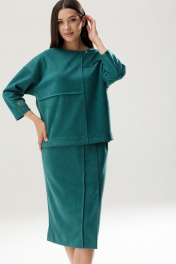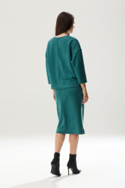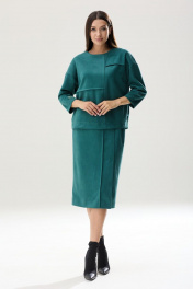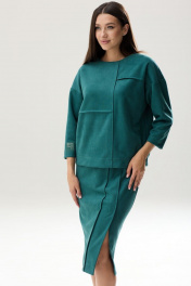Роскошный комплект: блузон и юбка из тканой замши глубокого тона. Блузон прямого свободного кроя. Перед блузона разделен ассиметричной вертикальной линией с декоративным швом строчкой 0.7 см и горизонтальными складками-защипами, шириной 0.7 см. Блузон имеет округлую горловину и спущенную линию плеча. Рукав одношовный, со спущенным окатом, зауженный к запястью. Длина рукава 3/4.(37см) На одном рукаве, в качестве декора, притачена небольшая нашивка-отделка. На спинке изделия расположена в качестве застежки-потайная молния. Длина блузона по линии спинки 56-57 см(в зависимости от размерного ряда). Юбка комплекта на подкладке, прямого силуэта, чуть заужена к низу. Спереди юбки, со смещенным центром влево - вертикальные линии отделочные складки, шириной 0.7 см с отделочной строчкой. В крайней из этих складок расположена шлица с открытым разрезом, высотой 33 см. В среднем шве заднего полотнища расположена застежка - потайная молния. По линии талии расположены вытачки. Изделие на поясе, высотой 3,5 см. В боковых отрезках пояса эластичная тесьма. Фиксируется пояс сзади на функциональную застежку петля-пуговица. Длина юбки-70 см *фурнитура может отличаться от представленной на рекламном фотоматериале Особые рекомендации: рекомендуется холодная деликатная ручная стирка, без использования отбеливающих СМС, без интенсивного трения. Сушка в вертикальном положении. ВТО с минимальным паром.