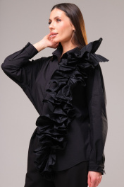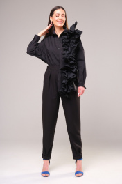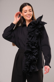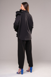 Безупречный комплект в благородном монотоне, состоящий из свободной блузы рубашечного кроя с вертикальной рюшей и современных брюк. Блуза прямого свободного силуэта с рубашечным воротником на стойке и зауженным рукавом на манжете, со спущенной линией плеча. Акцентная фронтальная деталь: вертикально - асимметричная рюша. Сборка по центру рюши придает форму детали. Спереди на функциональной планке петли-пуговицы. Спинка изделия имеет горизонтальную плечевую кокетку и встречную складку для свободы облегания. По плечевому шву заложена складка. Низ блузона слегка фигурный: спинка и полочка чуть длиннее бокового шва. Длина изделия блузона по спинке 73,5 см. Рукав рубашечный одношовный, завершается манжетой (высота 5 см) с застежкой петля-пуговица. Длина спущенного плечевого шва 33 см. Длина рукава с манжетой 41 см. Брюки современного силуэта. Карманы-хулиганы расположены в боковых швах. На задней части брюк расположен ложный карман-листочка. Фронтальная застежка на клапан-молнию (гульфик) и пуговицу. Для дополнительной фиксации объема талии спереди расположены полупояса с пряжкой из полуколец. На линии талии переда, также расположены складки-защипы для свободы входа в карман. На передних полотнищах брюк внизу заложены две модельные складки для уменьшения ширины низа изделия. Оканчиваются брюки деликатным отворотом, шириной 2,5 см. Длина брюк по боковому шву с отворотом 99 см. Представленная фурнитура может отличаться от представленной на фото/видео материале. Особые рекомендации: рекомендуется холодная деликатная ручная стирка, без использования отбеливающих СМС, без интенсивного трения. Сушка в вертикальном положении. ВТО с минимальным паром.
