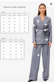 Стильный гармоничный комплект, состоящий из жакета и свободных брюк в стиле палаццо. Жакет прямого свободного силуэта на подкладке, с двухшовным рукавом, длиной 61-62 см с закрытой шлицей, на которой вертикально расположены 4 пуговицы. Английский отложной на стойке воротник, застежка однобортная фронтальная петли/пуговицы с закругленными бортами. На полочке расположены горизонтальные прорезные фигурные карманы с клапаном. Спинка жакета имеет средний шов. Детали кроя имеют рельефный бочок для удачной посадки изделия. Длина изделия по среднему шву спинки 71-73 см в зависимости от размерного ряда. Брюки комплекта созданы в свободном стиле палаццо. В пояс брюк по спинке вставлена эластичная тесьма, шириной 3 см. Спереди пояс фиксируется горизонтально на петли/пуговицы и вертикалную закрытую клапан-молнию (гульфик). При желании в пояс можно вставить ремень, так как имеются шлевочные держатели. В боковых швах карманы с наклонным входом, на поясной линии талии расположены две неглубокие складки для свободы движения. Длина брюк по боковому шву 105-107 см в зависимости от размерного ряда. Дополнительно в комплекте присутствует текстильный пояс и текстильная брошь.