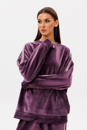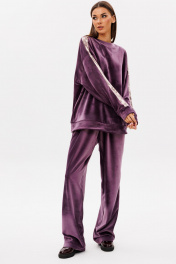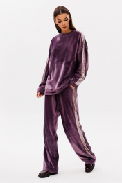 Стильный современный комплект в стиле «гламурный спорт» из трикотажного полотна с бликующим ворсом, состоящий из свитшота и брюк с лампасами из полотна с пайетками. Свитшот прямого свободного силуэта в стиле oversize со спущенной линией плеча. Рукав трехшовный, оканчивается манжетой шириной 5,5 см. По центру линии плеча рукава, вставлены лампасы из декоративного полотна с пайетками шириной 4 см. Горловина имеет округлый вырез, обработана планкой по косой, шириной 3 см. Низ изделия обработан планкой-манжетой, высотой 6,5 см. Длина изделия свитшота по центральной линии спинки 68-72 см в зависимости от размерного ряда. Брюки комплекта прямого свободного силуэта. В боковых швах расположены внутренние наклонные карманы и лампасы из полотна с пайетками шириной 3 см. Спинка брюк имеет кокетку. Пояс со вставленной эластичной тесьмой, шириной 4,5 см. Длина брюк по боковому шву 105-106 см. (фурнитура может отличаться от представленной на рекламном фотоматериале) Особые рекомендации: рекомендуется холодная деликатная ручная стирка, без использования отбеливающих СМС, без интенсивного трения. Сушка в вертикальном положении. ВТО с минимальным паром.