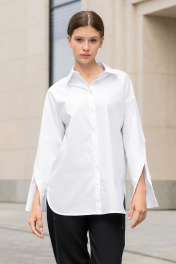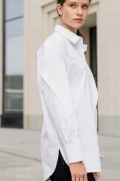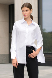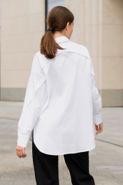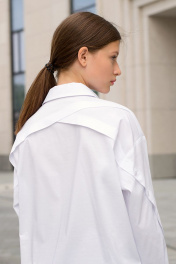 Рубашка из хлопка свободного силуэта с отложным воротником на стойке, со спущенным плечевым поясом. Застежка на петли-пуговицы. Спинка рубашки оформлена ассиметричной кокеткой со складками, переходящими на рукава, образуя ассиметричную застежку по всеё длине рукавов. Длина изделия по спинке 77 см. Длина плеча + рукава 72,2 см.