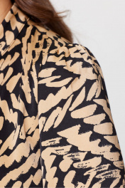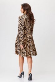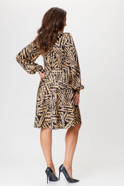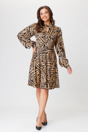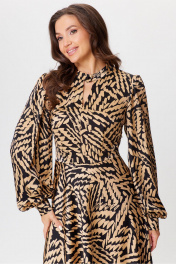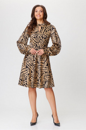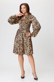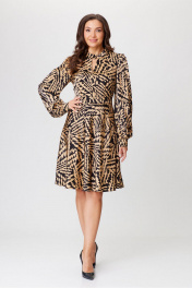 Платье женское, полуприлегающего силуэта, отрезное по линии талии. Полочка со швами по центру с V-образным вырезом. Воротник- стойка с застежкой на петлю и пуговицу. Рукав втачной, объемной формы, длинный. В верхней и нижней части рукава - сборка, по низу притачная манжета с застежкой на петли и пуговицы. Нижняя часть платья расклешенная к низу, крой "полусолнце". В боковом шве обработана тесьма- молния.