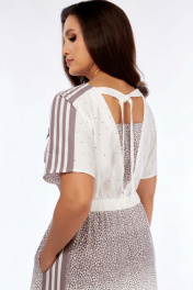 Платье женское А-образного силуэта ,свободного кроя, выполнено из плательной ткани с двойным дизайном. Горловина по переду по форме " лодочка", по спинке переходит в V-образную, с декоративной завязкой. Рукав цельнокроеный короткий. По талии в круговую обработана Кулиска с резинкой. В области плечей и по боковым швам юбки выполнены вставки из отделочной ткани. По лифу в области груди настрочены декоративные клапаны. Дл.платья от талии - 88 см., дл. рукава - 25 см.
