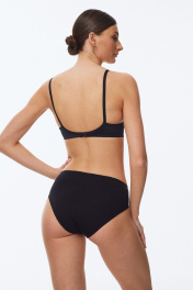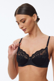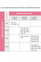 Бюстгальтер с мягкой чашкой, выполненный из эластичного трикотажного полотна и декорированный эластичным кружевом по всей чашке. Внутри - вставка из хлопка. Ширина бретелей увеличивается пропорционально увеличению размера (1,0 см, 1,5 см, 2,0 см, 2,5 см). В самых маленьких размерах застежка на 1 крючок из двух позиций, в большинстве размеров застежка на 2 крючка из трех позиций; в больших размерах на 3 крючка с выбором из трех позиций.