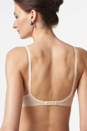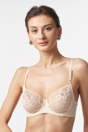 Бюстгальтер с мягкой чашкой, выполненный из эластичного трикотажного полотна и декорированный эластичным кружевом по всей чашке. Внутри чашки хлопок. В модели присутствуют каркасы («косточки»). Ширина бретелей увеличивается пропорционально увеличению размера.
