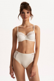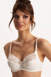 Бюстгальтер с мягкой чашкой, выполненный из эластичного трикотажного полотна и декорированный эластичным кружевом по всей чашке. Внутри - вставка из хлопка. Ширина бретелей увеличивается пропорционально увеличению размера.