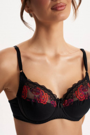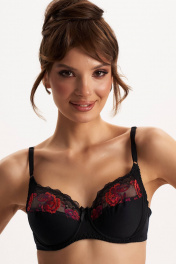 Бюстгальтер с мягкой чашкой, выполненный из эластичного трикотажного полотна и декорированный вышивкой. Есть боковая поддерживающая деталь, обеспечивающая дополнительное приподнимание груди. В модели присутствуют каркасы ("косточки"). Бретели регулируются по длине. Ширина бретелей увеличивается пропорционально увеличению размера (1,0 см, 1,5 см, 2,0 см, 2,5 см).