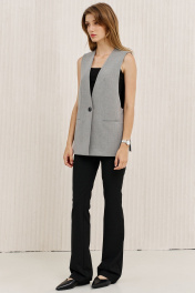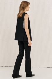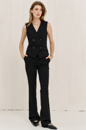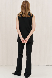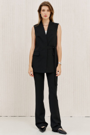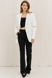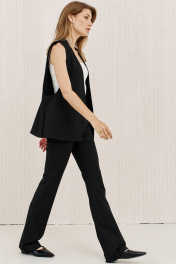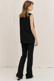 Брюки чуть расширены к низу от колена, с функциональными карманами по передним половинкам, на притачном поясе, застегивающимся на металлические крючки.