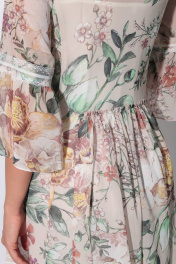 Платье из шифона прямого силуэта без подкладки, но в комплекте второе съемное платье-комбинация из креп-шифона. Вырез горловины фигурный  с окантовкой. По переду подрезы, декорированные французским кружевом. В области талии по переду и спинке подрез со сборкой. Рукав втачной 3/4 с притачной манжетой в виде волана на сборке. По низу изделия расположен притачной волан со сборкой. Рукав и боковая часть платья декорирован французским кружевом.