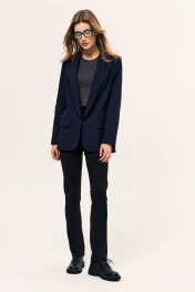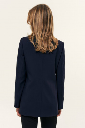 Жакет на подкладке, удлиненный прямого силуэта, без шлицы, в подрезе переда - карман в рамку с клапаном. Рукав длинный, двухшовный. Воротник - шаль, низ жакета с закругленными бортами, застежка заниженная на потайной металлический крючок.