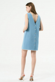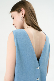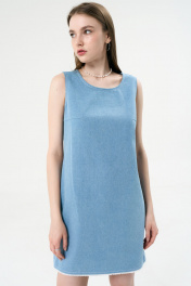 Джинсовый сарафан прямого силуэта. По переду нагрудная вытачка. Вырез горловины круглый. Застежка на металлические кнопки и петли по спинке. Спинка с V-образным вырезом. По низу сарафана бахрома.