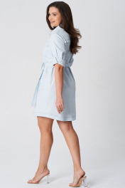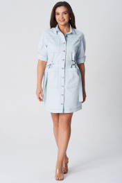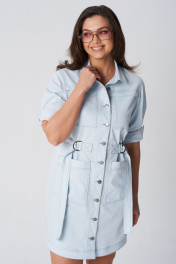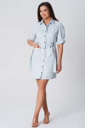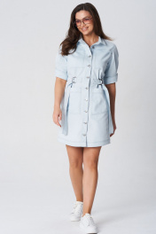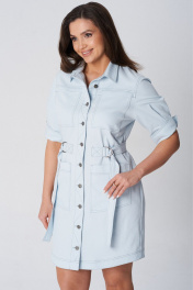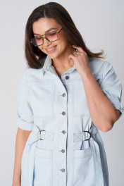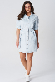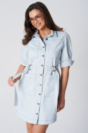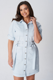 Джинсовое платье прямого силуэта, По переду горизонтальная кокетка имитация отлетной, два нагрудных накладных кармана и два накладных кармана ниже линии талии. Рукава короткие втачные с отложными манжетами с разрезами. Застежка центральная бортовая на петли и кнопки. воротник рубашечного типа с отрезной стойкой. По спинке горизонтальная кокетка имитация отлетной. По талии настрочены паты с полукольцами на которые крепится пояс из основной ткани. Отделкой платья является декоративная отстрочка по всем швам платья контрастной нитью.