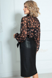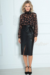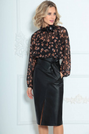 Юбка женская из кожи на подкладке, длиной ниже колена с завышенной линией талии. По переднему полотнищу функциональные прорезные карманы с листачкой, наклонным подрезом и разрезом в нем. По заднему полотнищу средний шов и вытачки. Юбка на притачном поясе со шлевками и декоративным отворотом. В комплект входит съемный пояс из основной ткани.