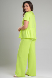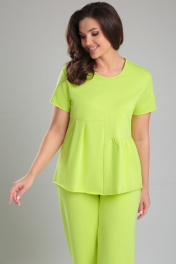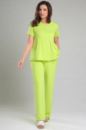 Комплект женский состоящий из футболки и брюк. Футболка прямого силуэта со средним швом и асимметричными горизонтальными подрезами. Нижняя правая часть переда с одной складкой, по левой части переда сборка. Спинка со средним швом и горизонтальным подрезом на левой стороне, от подреза спроектирована сборка. Рукав втачной, одношовный, короткий. Вырез горловины круглый, окантован основной тканью, по горловине спинке завязки. Брюки прямые, на притачном поясе с резинкой, без застёжки. По переду расположены функциональные боковые карманы-хулиганы. Низ рукава, брюк и футболки не обработаны.