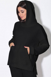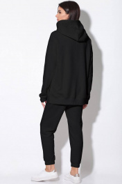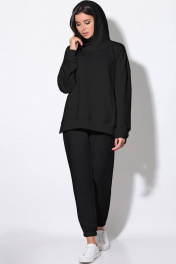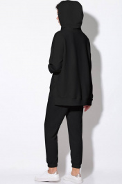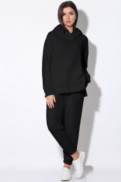 Комплект женский, 2-х предметный, состоящий из джемпера (худи) и брюк. Худи прямого силуэта, с капюшоном, со спущенной линией плеча и накладным фигурным карманом-«кенгуру». Низ изделия асимметричный-перед короче, а спинка длиннее. Низ худи и низ рукава обработан притачной планкой и манжетой из отделочного довяза в цвет основного материала. В боковых швах имеются разрезы. Брюки на притачном поясе с резинкой по кругу. Задняя половинка брюк без конструктивных особенностей. Передняя половинка брюк с боковыми карманами- хулиганами и декоративной складкой . В среднем шве передней половинки брюк – имитация застежки. Низ брюк присборен резинкой-имитация манжета.