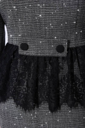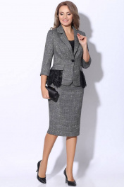 Комплект женский состоящий из жакета, блузки и юбки. Жакет полуприлегающего силуэта на подкладке. Воротник пиджачного типа, застежка центральная бортовая на одной петле и пуговице. Рукав втачной длиной 7/8. По переду и спинке баска из отделочного кружева(не съемное). Блузка полуприлегающего силуэта, без рукава, со спущенным плечом. Вырез горловины круглый,без застежки. Юбка полуприлегающего силуэта на подкладке с притачным поясом в 44-48 без резинки, 50-54 с резинкой по бокам. Застежка на потайную тесьму-молнию в среднем шве спинки и разрез.