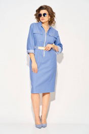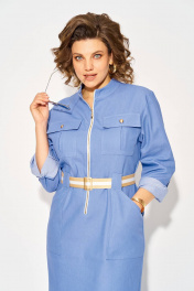 Стильное и эффектное платье, в стиле- сафари! Модель выполнена из хлопкового джинса! Платье полуприталенного силуэта, длиной за колено. По талии отрезное. Воротник - небольшая стойка, переходящая в застежку на металлическую молнию. Рука рубашечный, полной длины. По низу рукава предусмотрен манжет с застежкой на пуговку. По полочке расположены накладные карманы с клапаном. В платье также предусмотрены накладные карманы. По спинке кокетка с центральным швом переходящий в разрез на свободу движения. В платье предусмотрен съёмный пояс с металлической пряжкой! Длина – 110, рукав – 62 см.