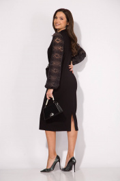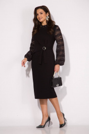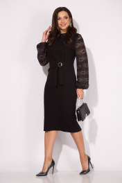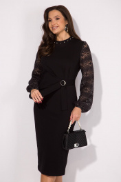 Эта модель платья из мягкого, уютного трикотажа подходит как для повседневного использования, так и для торжественных мероприятий. Прочная и эластичная ткань делает его незаменимым элементом вашего гардероба. Облегающий силуэт с эффектным подрезом по линии талии, переходящий в пояс с металлической пряжкой акцентирует фигуру и создает стильный, утончённый вид. Мягкая полулежащая стойка у горловины украшена пробивными бусинами из жемчуга. Спинка с центральным швом и обработанной шлицей по низу изделия. Застежка – потайная тесьма-молния по спинке. Эффектный ажурный рукав из сетки с вышивкой крючком дополняют и без того элегантный образ. Длина по спинке – 112 см., рукав – 62 см.