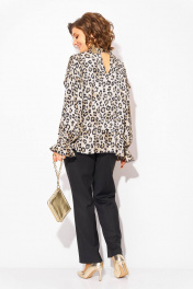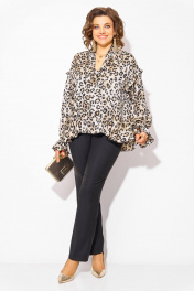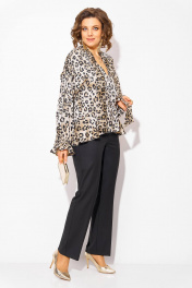 Леопардовая нарядная блузка в стиле «Оверсайз» – это модный предмет гардероба, который ассоциируется с уверенностью и энергией. Модель свободного силуэта трапеция, с ассиметричной линией низа. Линия горловины v-образная, переходит в мягкую стойку-бант. Рукав длинный на резинке, на спущенном плечевом поясе. Низ изделия и низ рукава оформлен мягким воланом. Спинка с небольшим v-образным вырезом. Брюки в комплекте прямого фасона, средней посадки. Пояс притачной, в боковых участках вставлена резинка. Застежка – брючная тесьма-молния с обработанным гульфиком. По переду заутюжены канты. Струящаяся ткань по типу «шифон-сатин» позволяет создавать как смелые, так и сдержанные образы, что дает возможность стилизовать их под конкретный случай – от делового до вечернего! Длина по спинке – 70 см, рукав- около 64 см. Длина по переду – 55 см. Брюки – 102-104 см.
