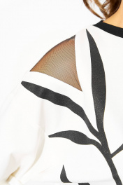 Нарядная блузка-туника больших размеров, выполнена из трикотажного джерси. Модель прямого силуэта, со спущенной линией плеча и рукавом длиной ¾-ти. Модель с округлым вырезом горловины на мягкой притачной планке контрастного цвета. По бокам предусмотрены разрезы на свободу. Полочка декорирована печатью накатом с мерцающим эффектом в виде ветви. На плече ассиметричная вставка из сетки. Вы в поиске универсальной блузки которую легко совмещать с разными образами? Тогда ваш выбор наша блузка женская, которая идеально решит все эти задачи! Длина по спинке – 70 см, рукав – около 45 см.