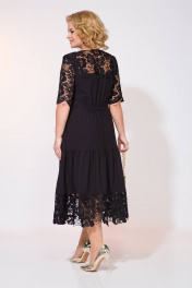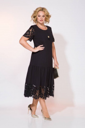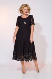 Черный – классика нарядного платья. Модель полуприталенного силуэта, с округлым вырезом горловины. Ниже бедер платье отрезное, с присборенной деталью с хлопковым кружевом. Рукав точной, укороченный, кружевной. Спинка с кружевной кокеткой/, с продольными рельефами.По талии небольшая сборка на резинку. В комплекте съемное украшение в виде подвески (дизайн может изменяться!)