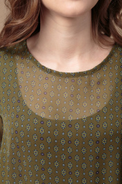 Платье женское из полупрозрачной ткани с принтом на отдельной трикотажной подкладке. Силуэт расширенный к низу с воланом на сборку. Рукав втачной 3/4 на резинке по низу. Вырез горловины круглый с окантовкой из основной ткани, сзади на завязке. Спереди нагрудные вытачки из проймы. Спинка длиннее переда. Длина спинки - 107см, длина переда - 105см. ПОГ:48р-53см, 50р-55см, 52р-57см. ПОБ:48р-58,5см, 50р-60,5см, 52р-62,5см.