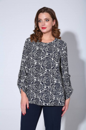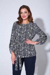 Блуза прямого силуэта. Рукав втачной, собран на пату с пуговицей. Спинка со средним швом и потайной молнией. По боковым швам разрезы. Имеется съемный пояс из основной ткани. Длина блузы по середине спинки: 66 см.