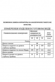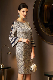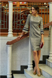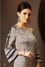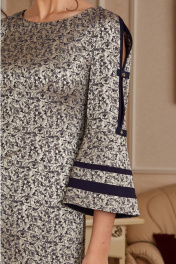 Платье с округлым вырезом горловины. Спинка с потайной молнией и шлицей в среднем шве. Рукава втачные ¾ с декоративными вырезами в верхней части и отрезной манжетой в нижней. ВОЗМОЖНА ЗАМЕНА ФУРНИТУРЫ НА АНАЛОГИЧНУЮ ТАКОГО ЖЕ КАЧЕСТВА.