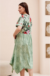 Эффектное платье в стиле «Бохо» с цельнокроеным рукавом и настрочными карманами выполнено из очень мягкой и приятной ткани. Платье а-образного силуэта с округлым вырезом и отрезным лифом, нижняя часть (юбка) на сборке. Лиф цельнокроеный с узкой отрезной бейкой по горловине и притачными манжетами из однотона. Низ платья фигурный с притачными вставками по бокам. Спинка как и перед отрезная.