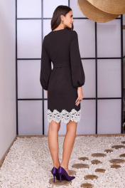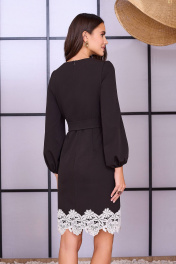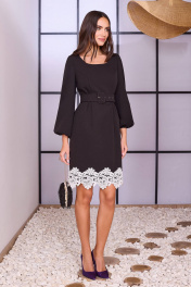 Платье с округлым вырезом горловины, съёмным поясом из ткани по талии и кружевом по низу. Перед с полурельефами. Спинка с потайной молнией в среднем шве и талиевыми вытачками. Рукава втачные с узкой резинкой по низу.