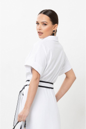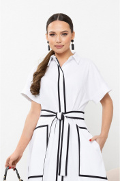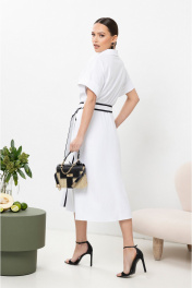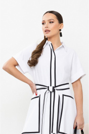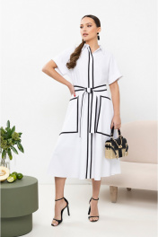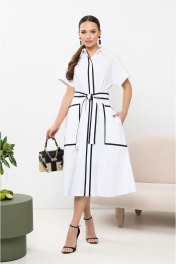 Платье со стояче-отложным воротником, отрезное по талии и центральной застёжкой на пуговицы. На уровне талии съёмный пояс из ткани с контрастной отделкой. Перед с накладными карманами в нижней части. Спинка с талиевыми вытачками и средним швом от талии. Платье с цельнокроеными рукавами и с отворотами по низу. По планке и карманам отделка из контрастной ткани. Изделие на подкладке от талии. ВОЗМОЖНА ЗАМЕНА ФУРНИТУРЫ НА АНАЛОГИЧНУЮ ТАКОГО ЖЕ КАЧЕСТВА.
