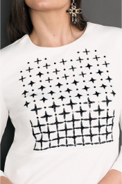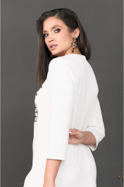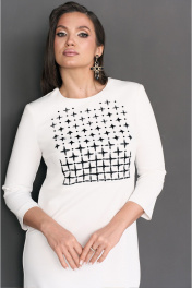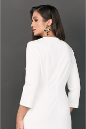 Платье с округлым вырезом горловины. Перед с дизайнерской вышивкой в верхней части и декоративным разрезом в нижней части платья. Спинка с потайной молнией в среднем шве и талиевыми вытачками. Рукава втачные. ВОЗМОЖНА ЗАМЕНА ФУРНИТУРЫ НА АНАЛОГИЧНУЮ ТАКОГО ЖЕ КАЧЕСТВА.