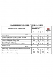 Жакет со стояче-отложным воротником и центральной застёжкой на молнию. Перед с декором (бахромой) из основной ткани. Рукава втачные с бахромой по низу. Жакет на подкладке. Юбка на поясе с резинкой. Заднее полотнище с потайной молнией и разрезом в среднем шве. Юбка на подкладке.