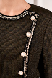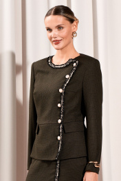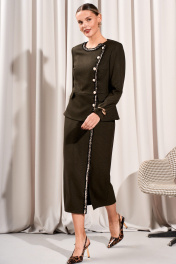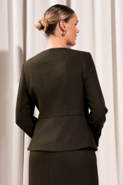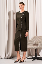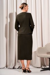 Костюм юбочный Жакет с округлым вырезом горловины и смещённой застёжкой на петли и пуговицы. Изделие с отрезной баской. Перед с клапанами от баски. Спинка со средним швом и талиевыми вытачками до баски. Рукава втачные. По горловине и краю борта располагается декоративная тесьма. Жакет на подкладке. Юбка на поясе с резинкой. Переднее полотнище с разрезом в нижней части и настрочной декоративной тесьмой. Заднее полотнище с потайной молнией в среднем шве. Юбка на подкладке.