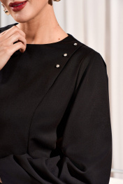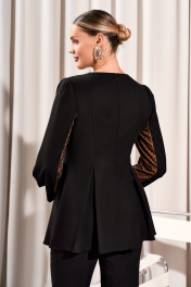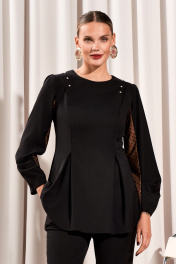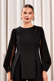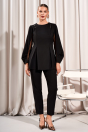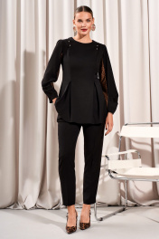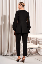 Костюм брючный Свитшот с округлым вырезом горловины и складками от рельефов по переду и спинке. Перед со стразами в верхней части. Спинка с потайной молнией в среднем шве. Рукава втачные со складками по окату и со складками нижней части рукава, и с деталью из декоративной сетки и подложки. Брюки на притачном поясе. Передние половинки с наклонными карманами к боковым швам