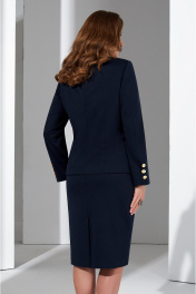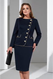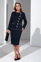 Дизайнерский юбочный костюм выполнен в минималистичном стиле с акцентом на яркие пуговицы и контрастный кант. Ассиметричный жакет с округлым вырезом и отрезными бочками. Перед оформлен полурельефами до входа в карман. От горловины по краю борта и низу жакета вставлен контрастный кант. Карманы с клапаном и листочкой (в шов обтачивания клапана вставлен кант). Спинка со средним швом и отрезными бочками. Рукава втачные свободные. Юбка карандаш с отрезным поясом по бокам на резинке, застежка на потайную молнию в среднем шве спинки, по низу юбки шлица. Жакет и юбка на подкладке. ВОЗМОЖНА ЗАМЕНА ФУРНИТУРЫ НА АНАЛОГИЧНУЮ ТАКОГО ЖЕ КАЧЕСТВА.