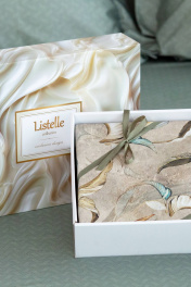 Коллекция «АЙРИС» создаст удивительный шарм и шик спальной комнате Многослойность рисунка в сочетании с изыскано вписанными элементами волшебных ирисов на ткани для пододеяльника и наволочек создает утонченный образ. Для простыни подобрана дуэтная ткань с мелким четко выраженным оригинальным принтом, который придает изделию роскошный вид. Двуспальный пододеяльник 180х215см - 1 шт. простыня 215х240 см - 1 шт. наволочка 50х70 см - 2 шт. Коробка дизайнерская подарочная фирменная 31х40х10 см