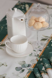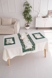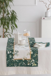 Дорожки коллекции «ЭВЕЛИНА» имеют специальную пропитку (влаго-, масло- и грязеотталкивающую обработку). Принт на ткани нанесен методом цифровой печати с использованием высококачественных красителей, благодаря чему изделия не линяют и не меняют свой цвет после многократных стирок. Рисунок по ткани виден только на лицевой стороне. ЭКСКЛЮЗИВНЫЙ ДИЗАЙН: Если изумрудный цвет вас завораживает, тогда новая коллекция «ЭВЕЛИНА» будет у вас дома! Это идеальное сочетание белого с изумрудным, подчеркнутое золотыми элементами в рисунке, мы увидели и прочувствовали уже на фотосессии. Дорожка на стол ""Эвелина"" размером 40х185см. Дорожка может расстилаться как поверх скатерти, так и отдельно, чтобы подчеркнуть фактурную поверхность стола; как вдоль стола, так и поперёк, создавая эффект ""диалога"" между людьми, сидящими друг напротив друга.