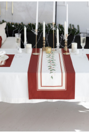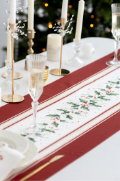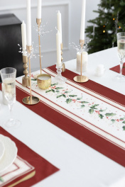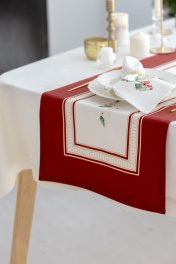Дорожка на стол "Элегант", 100% хлопок. Все дорожки коллекции «ЭЛЕГАНТ» выполнены из ткани для столового белья плотностью 190г/кв.м и имеют специальную пропитку (влаго-, масло- и грязеотталкивающую обработку). Принт на ткани нанесен методом цифровой печати с использованием высококачественных красителей, благодаря чему изделия не линяют и не меняют свой цвет после многократных стирок. Рисунок по ткани виден только на лицевой стороне. ЭКСКЛЮЗИВНЫЙ ДИЗАЙН: классический орнамент из веточек остролиста и красных ягод, дополненный элегантной каймой в красно-золотых тонах. Идеально подходит для новогодних и рождественских ужинов, семейных торжеств и уютных вечеров. Создайте атмосферу волшебства за вашим столом! УХОД ЗА ИЗДЕЛИЕМ: Изделия из натуральных тканей требуют особого ухода. Стирка при температуре 30 С; деликатный отжим (чтобы уменьшить смятость изделия), гладить изделия полувлажными при максимальной температуре, не отбеливать. Если при использовании изделий было нанесено пятно, рекомендуем испачканное изделие постирать не позднее следующего дня, т.к. натуральные нити ткани быстро впитывают натуральные красители еды и напитков (чай, кофе, соусы). При стирке изделий допускается использование пятновыводящих средств для цветного белья. После стирки возможна усадка изделия на 3-5%.